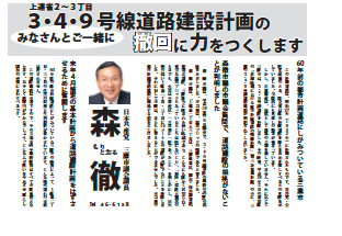 ◆活動紙面 PDFファイル139k 3・4・9号線道路建設計画の撤回に力をつくします。 60年前の都市計画道路にしがみついている三鷹市。 市議会質問で、道路建設の根拠がないことが判明しました。 道路建設計画をはずさせるために奮闘します。他